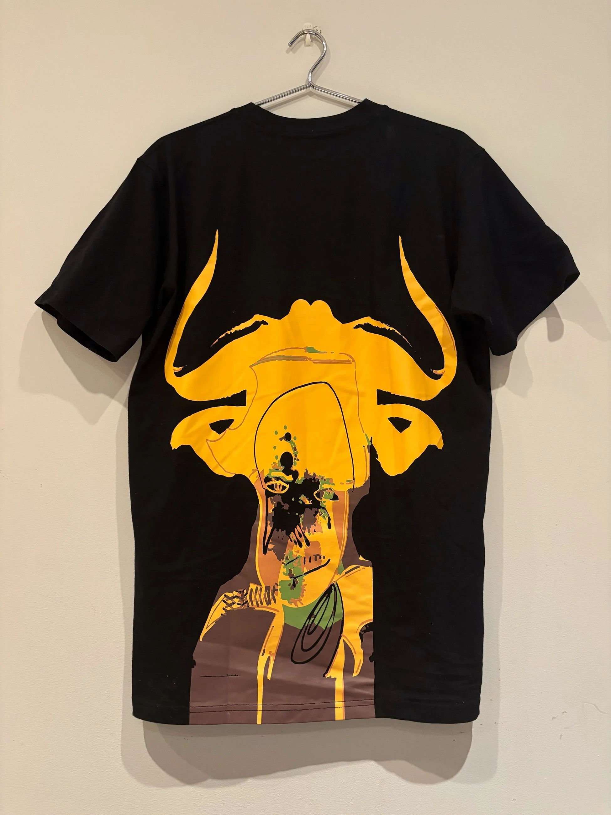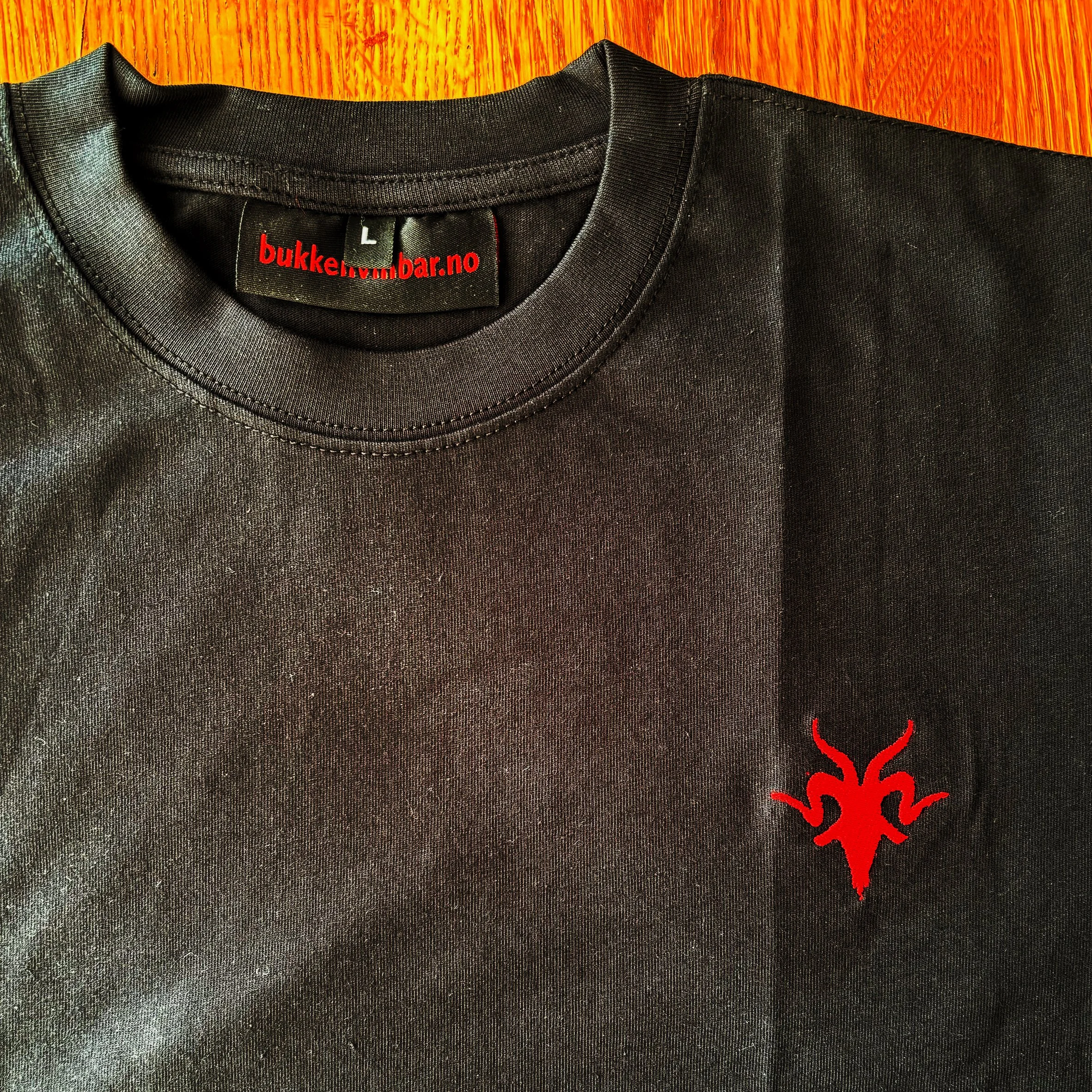 Spør personen som serverer deg. T skjortene er svarte og finnes i størrelsene M, L og XL. 100% bomull. Foran er Bukken-hodet sydd i rødt. På baksiden er det silketrykket en illustrasjon av Brian Grimwood på hele ryggen.